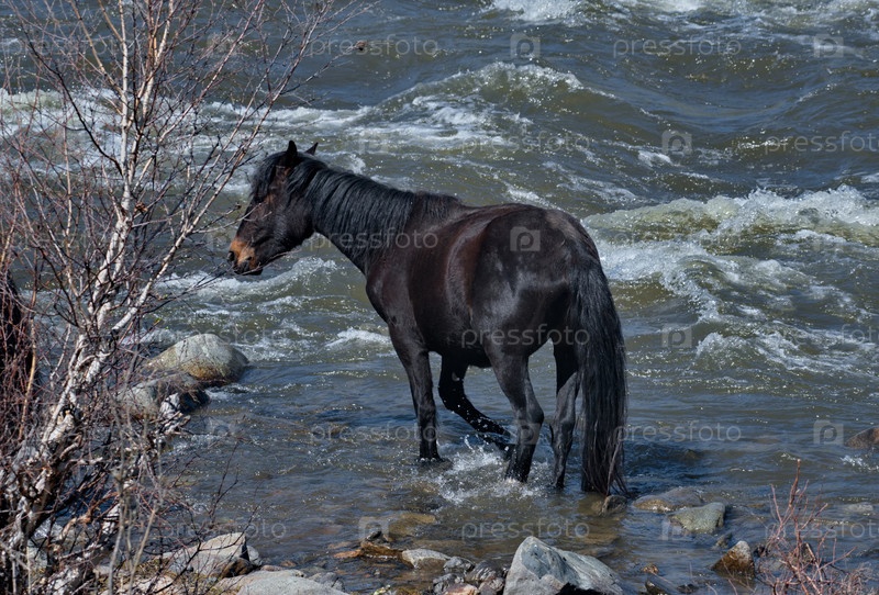 Россия. Юг Западной Сибири. Алтайские горы. Небольшое стадо лошадей с жеребцами сошло к реке Урсул на водоем возле деревни Онгудай