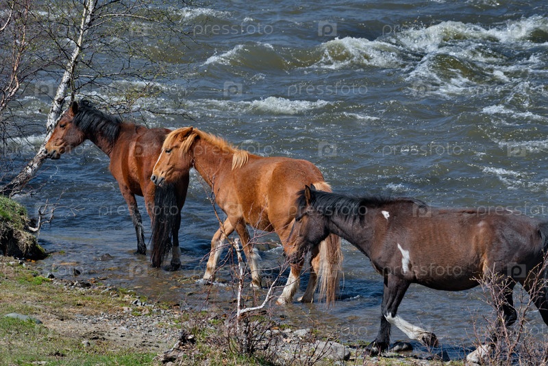 Россия. Юг Западной Сибири. Алтайские горы. Небольшое стадо лошадей с жеребцами сошло к реке Урсул на водоем возле деревни Онгудай