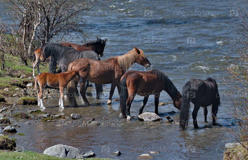 Россия. Юг Западной Сибири. Алтайские горы. Небольшое стадо лошадей с жеребцами сошло к реке Урсул на водоем возле деревни Онгудай