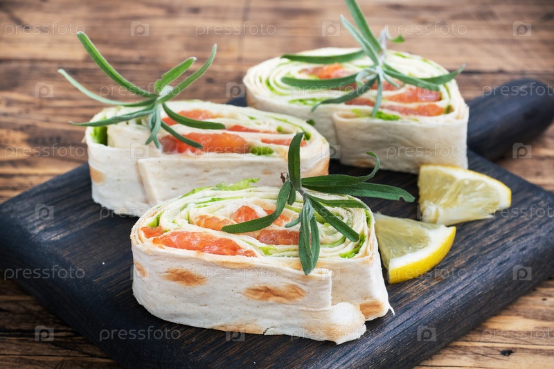 Рулоны из тонкого хлеба пита и красного соленого лосося с листьями салата на деревянной доске для резки
