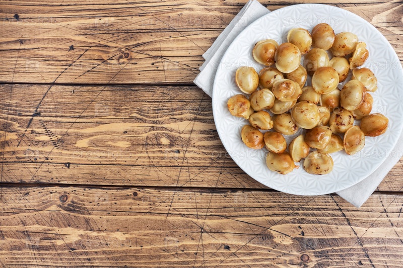 Традиционные жареные пельмени, равиоли, пюре с мясом на тарелке, русская кухня. деревянный сельский стол, пространство для копирования