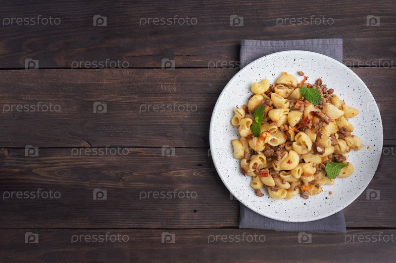 Запеченные макароны с фаршированной говядиной и овощами, макароны в стиле военно-морского флота на тарелке. темный деревянный фон. скопировать пространство