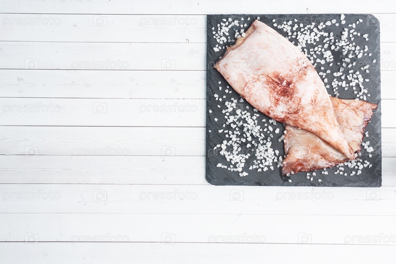 Необработанный труп кальмара с пряностями и грубой солью на черной доске