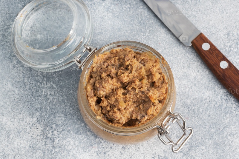 Домашняя куриная печень встряхивается в стеклянной банке на сером бетонном столе