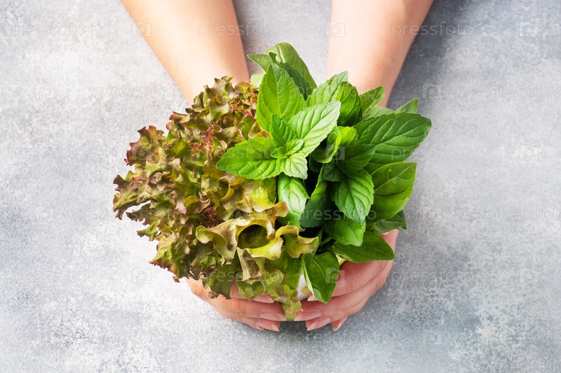 Свежие листья базилика, мята и салат. букет ароматных трав и специй и женские руки