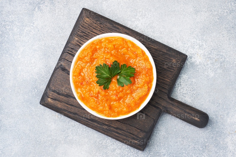 Домашнее производство икры из помидоров-кваша и лука в керамической тарелке на сером фоне. домашнее производство консервированных, консервированных тушеных овощей. вид сверху, копирование пространства