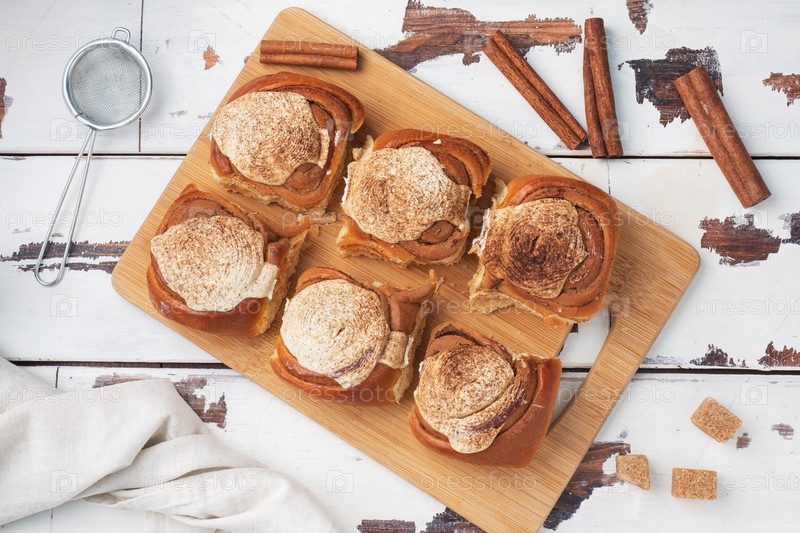 Канельбульские кексы из корицы с сливочной смесью на деревенском деревянном столе. Домашние свежие выпечки. Вид сверху, копировальное пространство