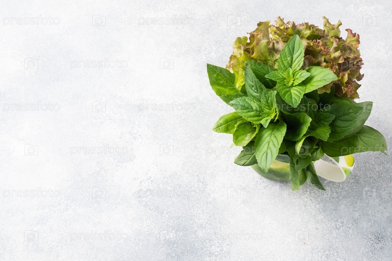 свежие листья базилика, мята и салат букет ароматных трав и специй копировать пробелы