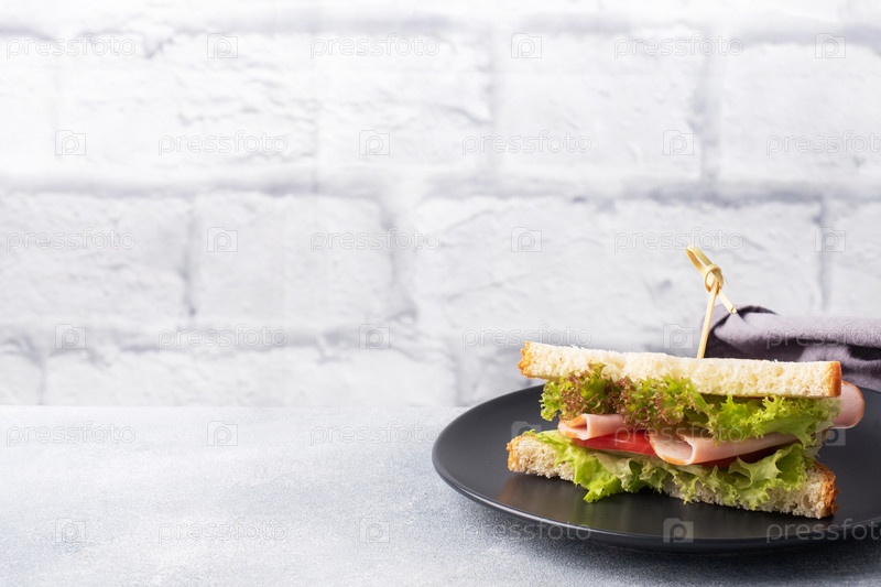Вкусный, здоровый бутерброд на завтрак. Тост за салат из листьев ветчины с томатами. Копировать пространство