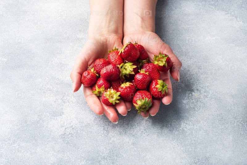 Горстка сочных спелых клубники в руке на бетонном фоне. сладкий, здоровый десерт, коллекция витаминов. копировать пространство
