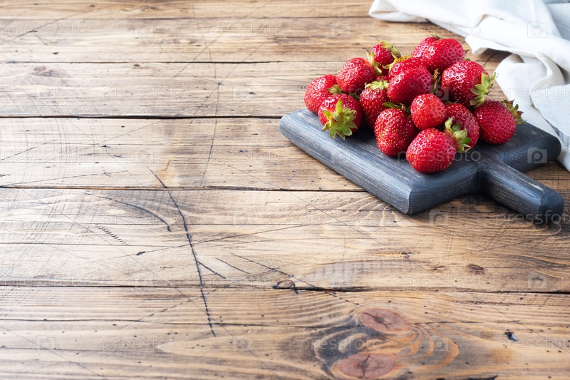 Горстка сочных спелых клубники на деревянном рустическом фоне. сладкий, здоровый десерт, витаминная коллекция. копировать пространство
