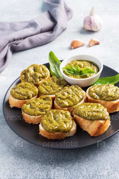 Сэндвичи с соусом песто, свежими листьями базилика и чесноком. вкусная здоровая закуска