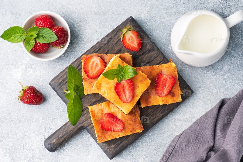 Вкусный домашний десерт из творога и свежих ягод с кремом Серый бетонный фон закрыт