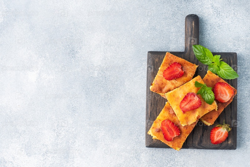 Вкусный домашний десерт из творога и свежих ягод с кремом Серый бетонный фон, пространство для копирования
