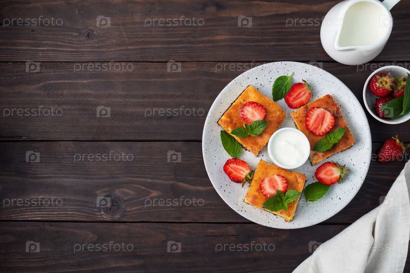 Сладкий домашний десерт из коттеджного сыра и свежих ягод с сливком. Темный деревянный фон, копирование пространства