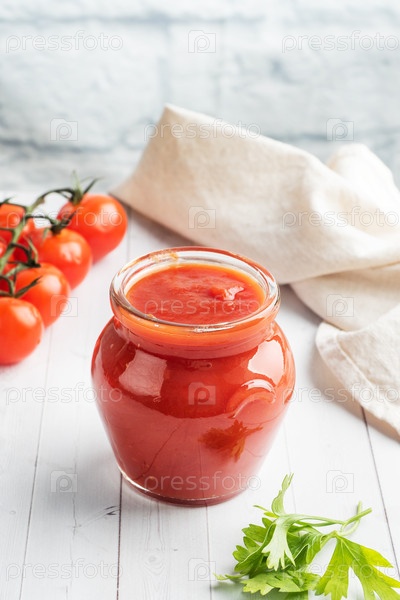 Помидоры в собственном соке или томатной пасте в стеклянной банке и свежие помидоры на белом деревянном столе