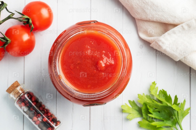 Томаты в собственном соке или томатной пасте в стеклянной банке и свежие помидоры на белом деревянном столе