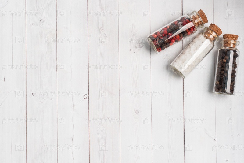 Специализируется на черном и красном перце и соли в стеклянных колбах на белом деревянном фоне с копировальным пространством
