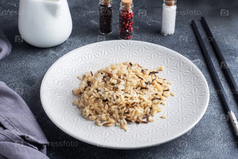 коричневый и неочищенный рис на тарелке с палочками. темно-бетонный фон. скопировать пробел