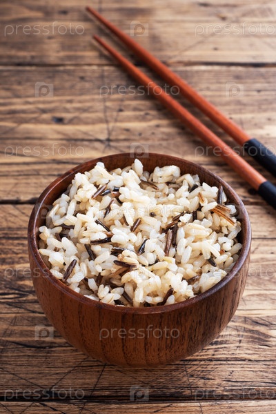 коричневый и неочищенный рис на тарелке с палочками деревянный рустический фон копировать пространство
