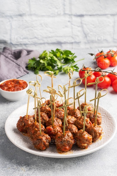 Говяжьи мясные булочки запекают в томатном соусе на тарелке с барбекю-кебабами