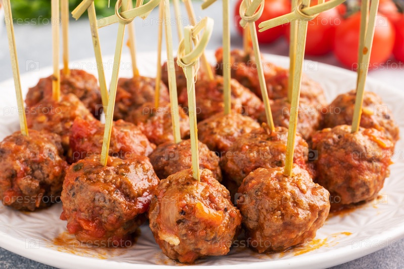 Говяжьи мясные булочки запекают в томатном соусе на тарелке с барбекю-кебабами