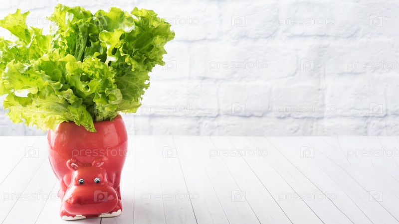Группа листьев салата в кружке в форме гиппопота на белом столе