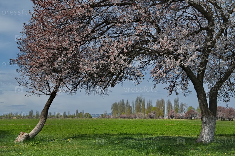 Вид цветущих абрикосовых деревьев в горных долинах вдоль Бишкекского шоссе - озеро Иссык-Кул