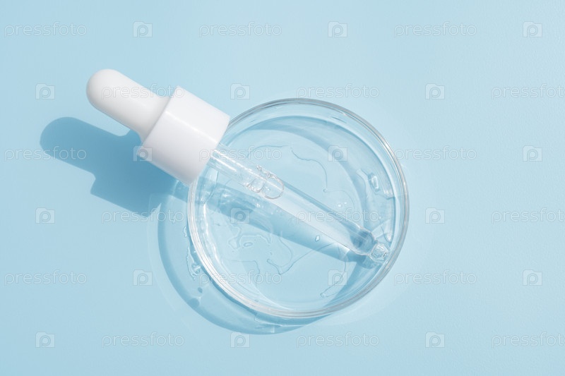 капли сыворотки в чашке Петри на синем фоне. капля масла для лица. красота Лицевая косметическая продукция текстура верхний вид. лосьон по уходу за телом