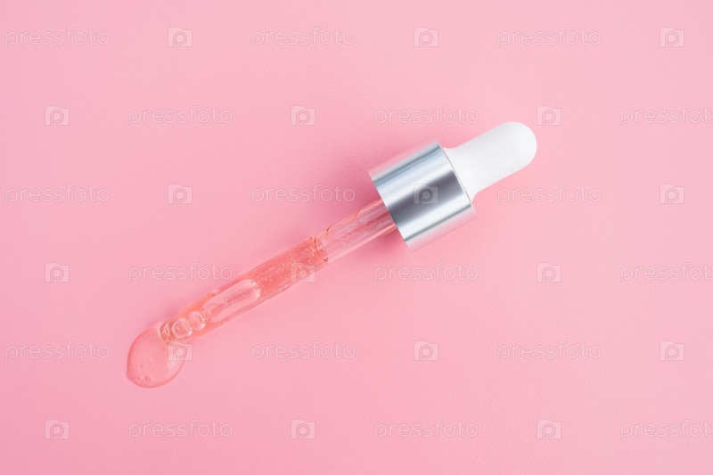 Мокап для маркировки стеклянной бутылки. Косметическая пипетка. Модный розовый фон. Концепция органической и косметической красоты. Вид сверху