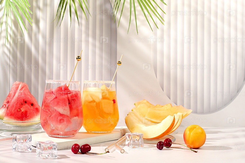 Освежающий летний домашний коктейль, сангрия, лимонад с арбузом, дыниной, смородиной, мятой, концепция похудения, здоровое и естественное питание, детоксикационная вода с фруктовым вкусом на светлом фоне