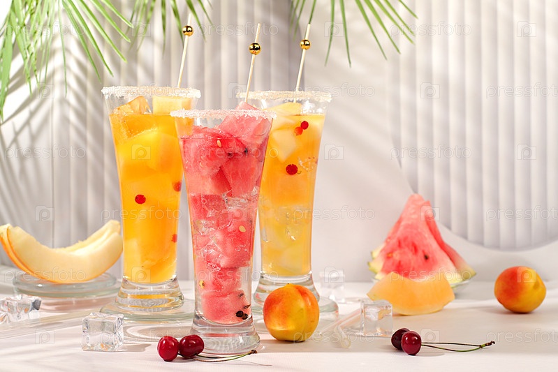 Освежающий летний домашний коктейль, сангрия, лимонад с арбузом, дыниной, смородиной, мятой, концепция похудения, здоровое и естественное питание, детоксикационная вода с фруктовым вкусом на светлом фоне