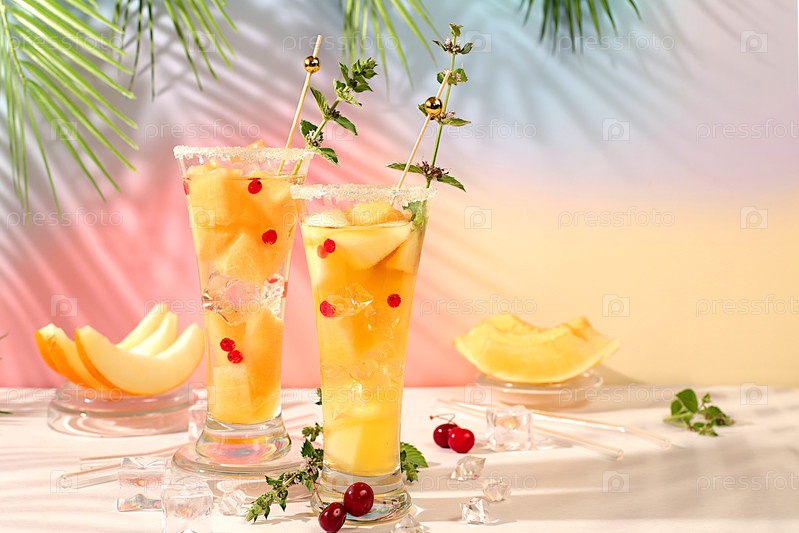 Освежающий летний домашний коктейль, сангрия, лимонад с дыниной, свеклами, мятой, концепция похудения, здоровое и естественное питание, детоксикационная вода с фруктовым вкусом на светлом фоне