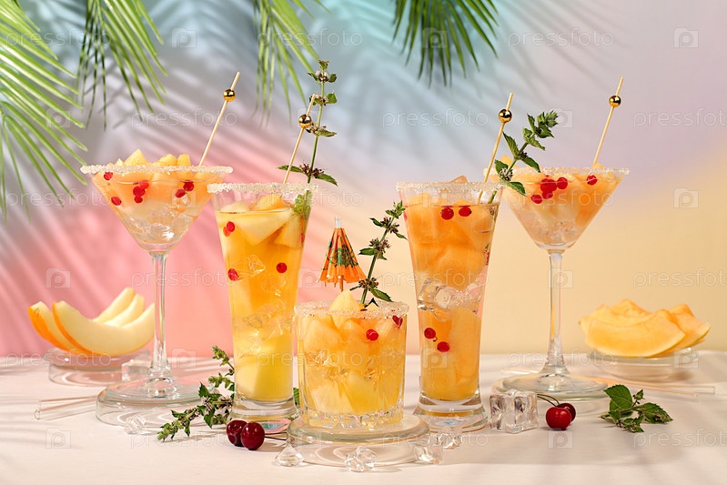Коктейль из дыни алкогольный или безалкогольный с мятой. Мартини, мохито и королевская сангрия со срезанными ломтиками, льдом, мятой и грецкими ягодами. Концепция летней вечеринки, реклама бара или кафе, диета для детоксикации