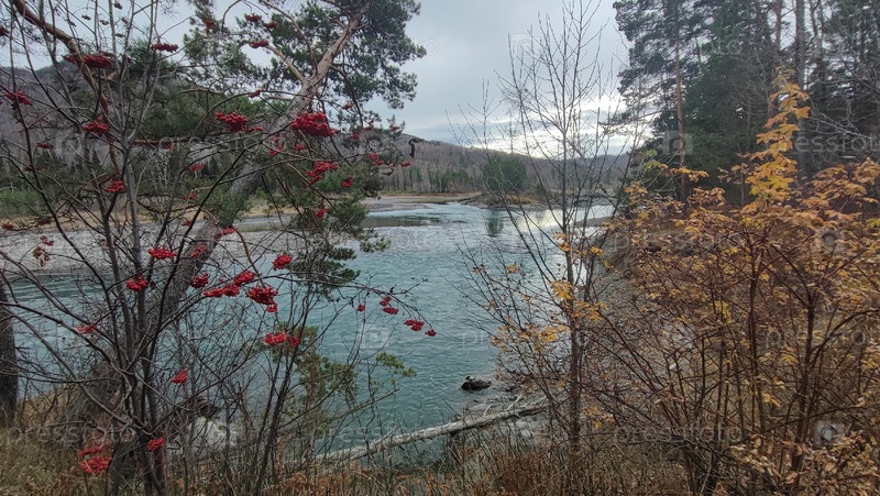 Туркуазный Катун, река в конце осени, пейзаж, Республика Алтай