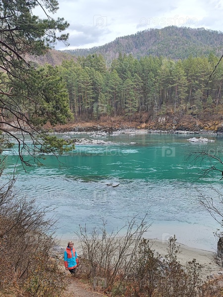 Туркуазный Катун, река в конце осени, пейзаж, Республика Алтай