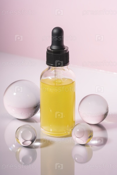 Увлажняющая бутылка капельницы с сывороткой для лица на успокаивающем розовом фоне, захватывающая свежесть спа-салона. Идеально подходит для контента самообслуживания и органического маркетинга по уходу за кожей