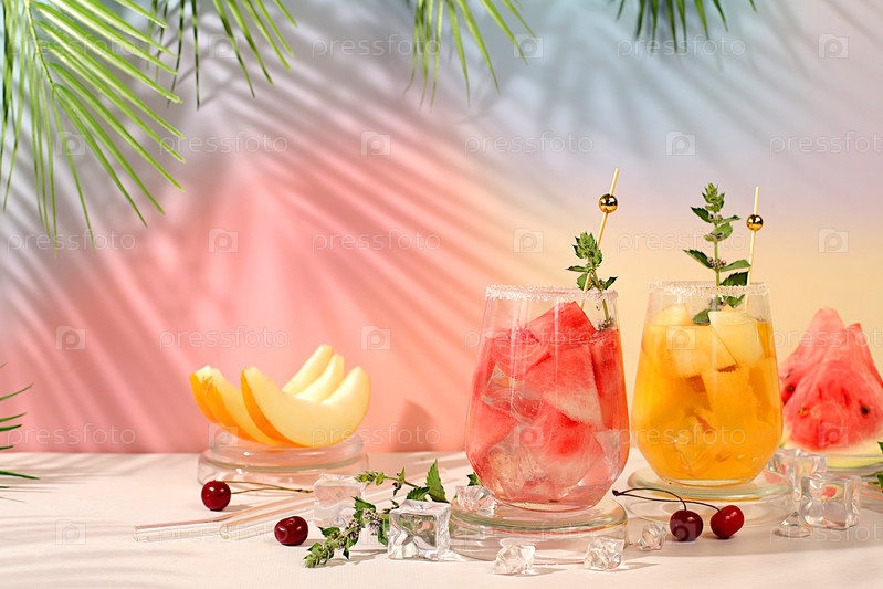 Лимонада с арбузом, дыном, свекрови, мятой, освежающий летний домашний коктейль, сангрия, концепция похудения, здоровое и естественное питание, детоксикационная вода с фруктовым вкусом на светлом фоне