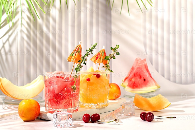 Мохито с дыни, мятой, арбузом, льдом с текилой, водкой или газированной водой на элегантном фоне, минималистическая барная концепция, безалкогольный напиток для похудения, рекламный баннер кафе