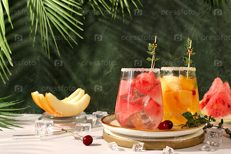 Лимонада с арбузом, дыном, свекрови, мятой, освежающий летний домашний коктейль, сангрия, концепция похудения, здоровое и естественное питание, детоксикационная вода с фруктовым вкусом на светлом фоне