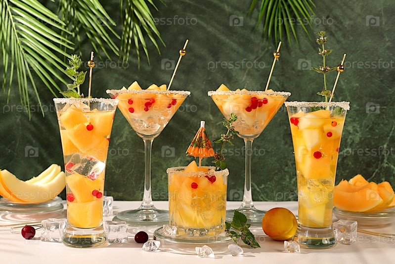 Коктейль из дыни алкогольный или безалкогольный с мятой. Мартини, мохито и королевская сангрия со срезанными ломтиками, льдом, мятой и грецкими ягодами. Концепция летней вечеринки, реклама бара или кафе, диета для детоксикации