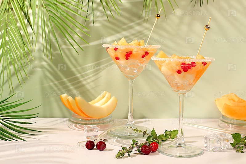 Алкогольный коктейль из дыни с мятой. Мартини и королевская сангрия со срезанными ломтиками, льдом, мятой и грецкими ягодами. Концепция летней вечеринки, реклама бара или кафе, диета для детоксикации