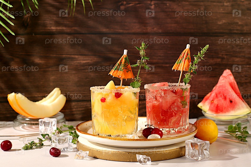 Мохито с дыни, мятой, арбузом, льдом с текилой, водкой или газированной водой на элегантном фоне, минималистическая барная концепция, безалкогольный напиток для похудения, рекламный баннер кафе