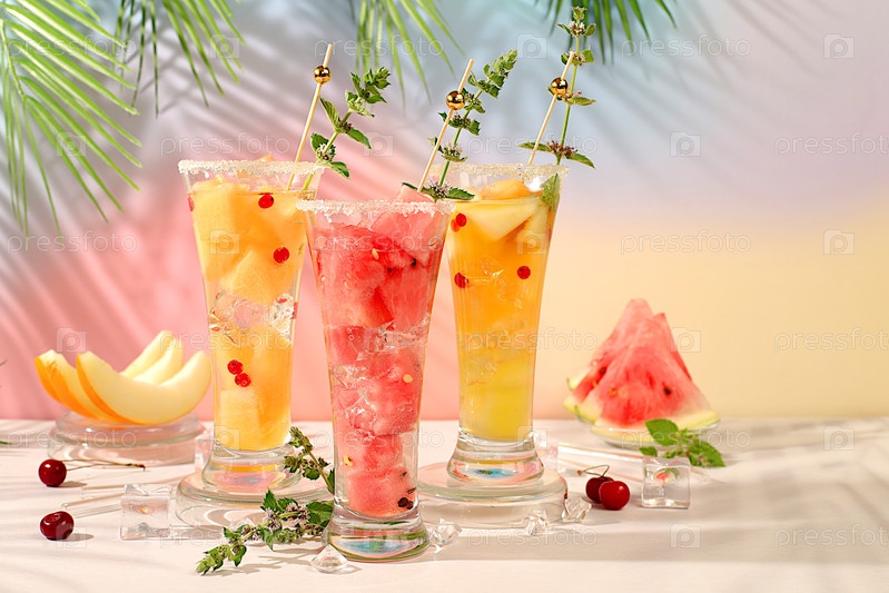 Освежающий летний домашний коктейль, сангрия, лимонад с арбузом, дыниной, смородиной, мятой, концепция похудения, здоровое и естественное питание, детоксикационная вода с фруктовым вкусом на светлом фоне