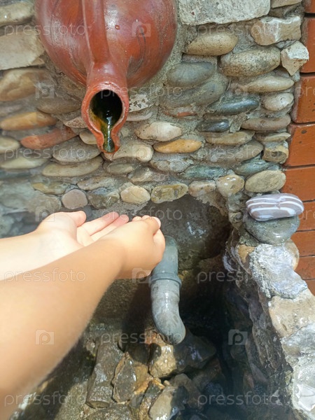 Руки ребенка с жаждой, ловя капли воды, представляющей чистоту против фонтана с деревенской каменной стеной