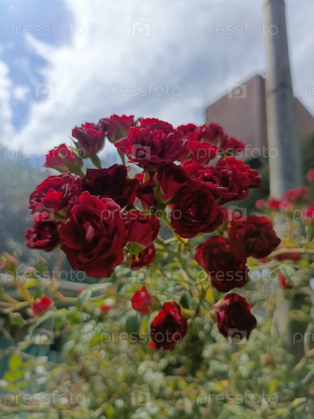 Букет темно-красных роз в романтическом стиле, богатых красно-зеленых цветов, представляющих любовь и страсть на размытом садовом фоне