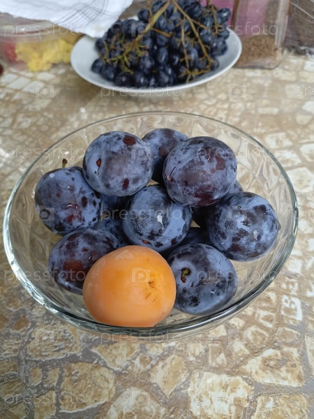 Слюны и абрикосы в стеклянной таре в реалистичном стиле натюрморта в фиолетовых, оранжевых и бежевых цветах, представляющие собой здоровое питание и урожай