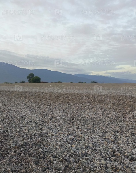 Пещеристый пляжный ландшафт в естественном стиле серого и белого цвета, представляющий собой спокойствие и природу на фоне горного хребта с копировальным пространством