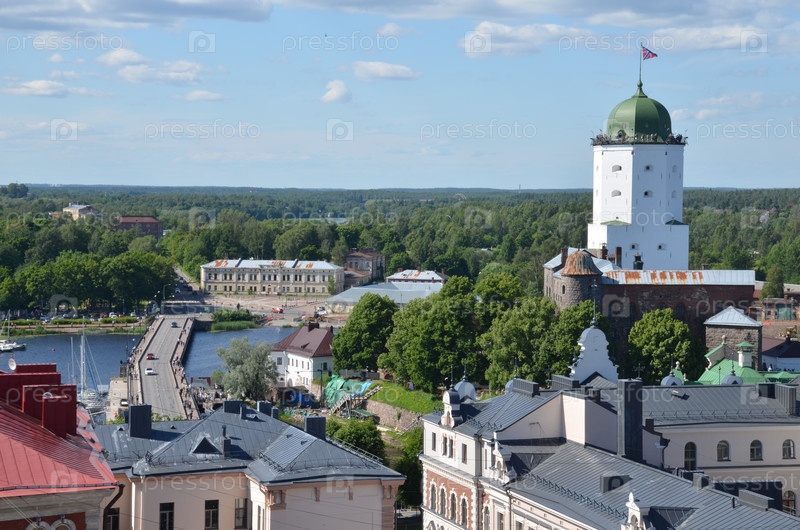 Вид на Выборгский замок, башню Святого Олафа и историческую часть города Выборга с смотровой площадки часовой башни