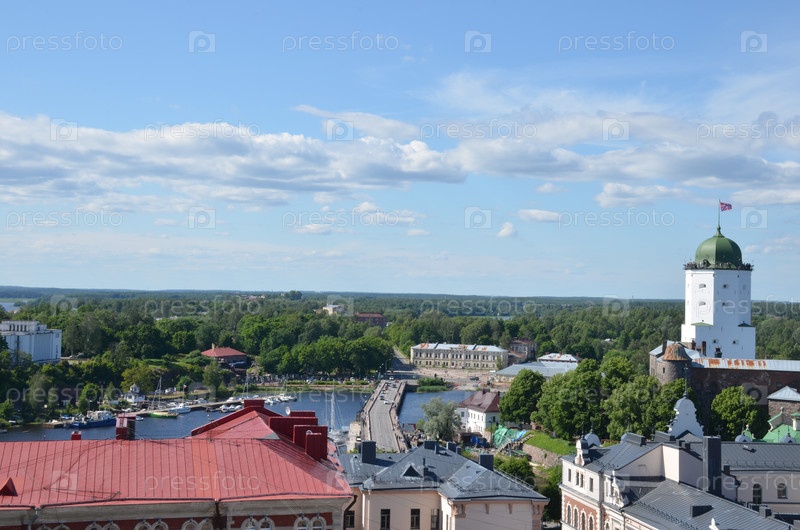 Вид на Выборгский замок, башню Святого Олафа и историческую часть города Выборга с смотровой площадки часовой башни